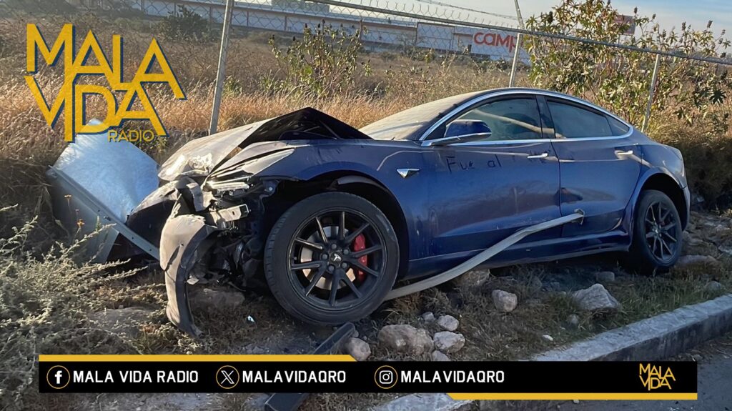 El Marqués, Qro., 16 de enero de 2026. Joven mujer sale ilesa tras protagonizar un aparatoso accidente vehicular cuando circulaba a bordo de su vehículo Tesla, lo anterior en el municipio de El Marqués.