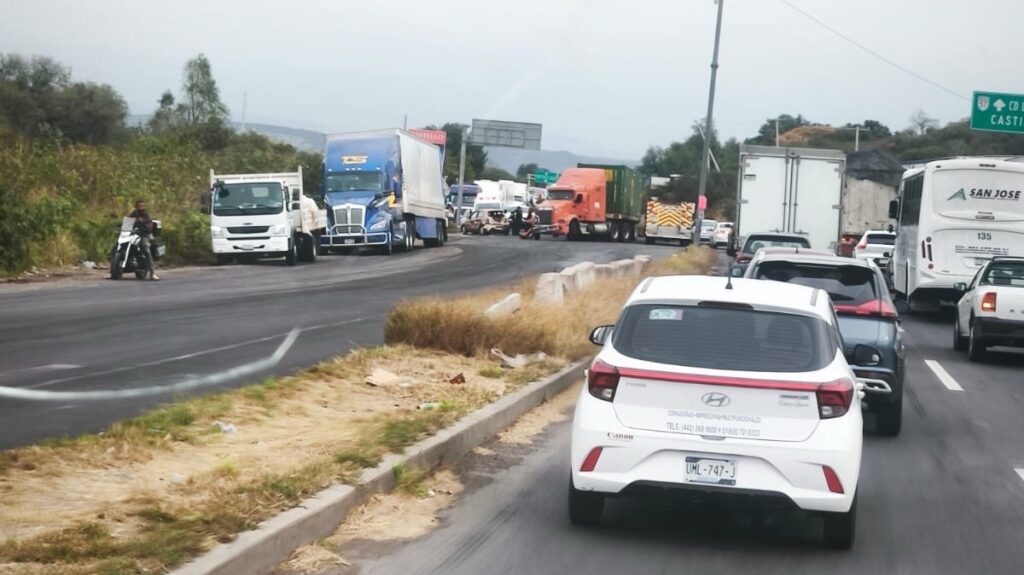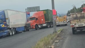 Corregidora, Qro., 20 de enero de 2026. Aparatoso accidente vehicular tipo choque múltiple se registró sobre los carriles del Libramiento Norponiente, el cual fue protagonizado por dos tractocamiones y dos vehículos particulares, por fortuna sólo se reportan daños materiales.