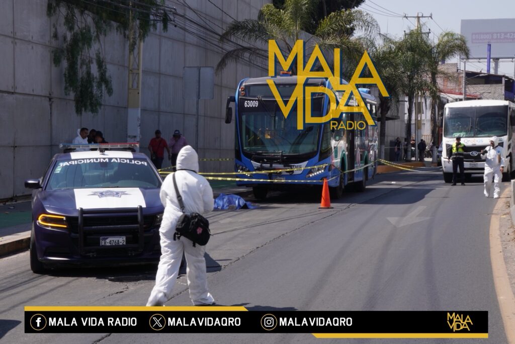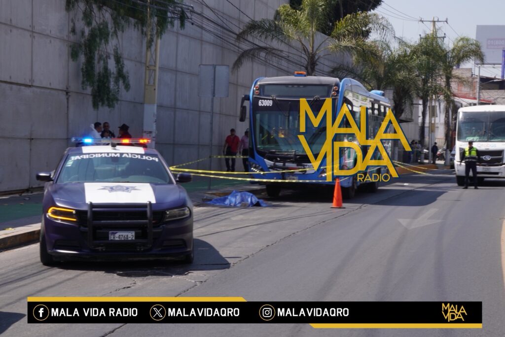 Corregidora, Qro., 13 de febrero 2026. Poco antes del medio día de este viernes, una mujer de aproximadamente 50 años de edad murió tras ser atropellada por una unidad de transporte público QroBús, en los carriles laterales de Paseo Constituyentes a la altura del distribuidor vial Santa Bárbara.