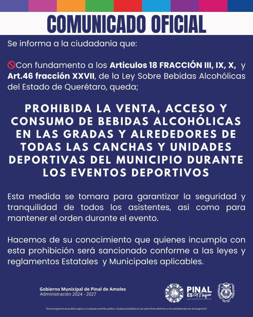 Pinal de Amoles, Qro., 13 de febrero de 2023. Se acabó la fiesta, el municipio de Pinal de Amoles, a través de un comunicado oficial dio a conocer a la ciudadanía que queda prohibida la venta, acceso y consumo de bebidas embriagantes en las gradas y alrededores de todas las canchas y unidades deportivas del municipio serrano.