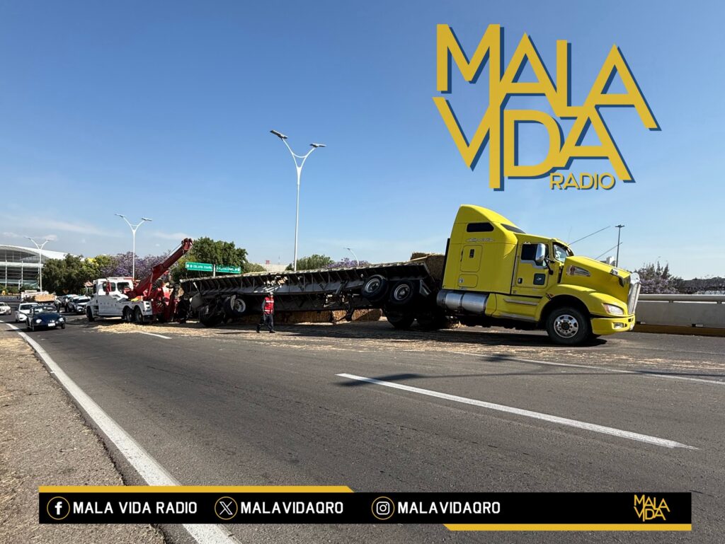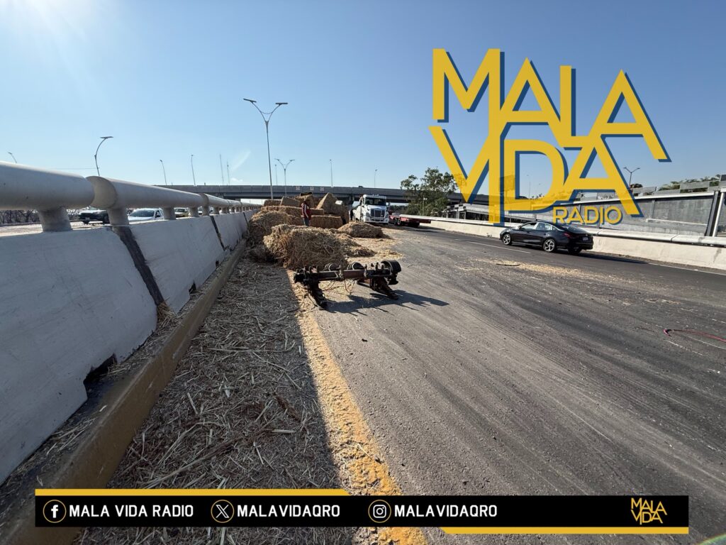 Querétaro, Qro., a 08 de abril del 2026. Una presunta falla mecánica provocó que un tráiler acoplado a una plataforma cargado con pacas de paja, volcara y derramara su carga sobre la carretera Celaya Cuota a la altura de Plaza Galerías en dirección a la Ciudad de México (CDMX).
