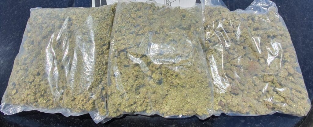 Derivado de lo anterior y para descartar cualquier tipo de delito o incivilidad, los policías estatales le marcaron el alto y le realizaron una revisión preventiva, localizándole tres bolsas de plástico en cuyo interior había hierba seca verde con las características propias de la marihuana, con un peso aproximado de tres kilos.